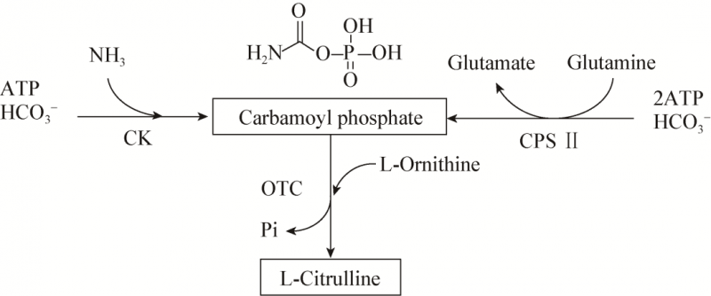 圖1氨甲酰磷酸的不同合成途徑與L-瓜氨酸合成途徑
