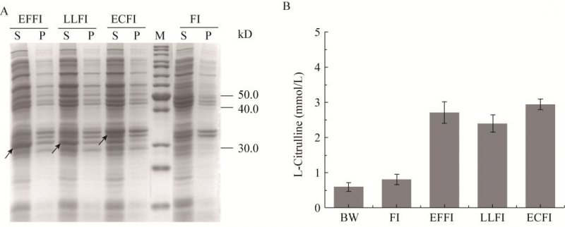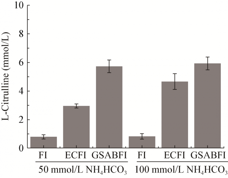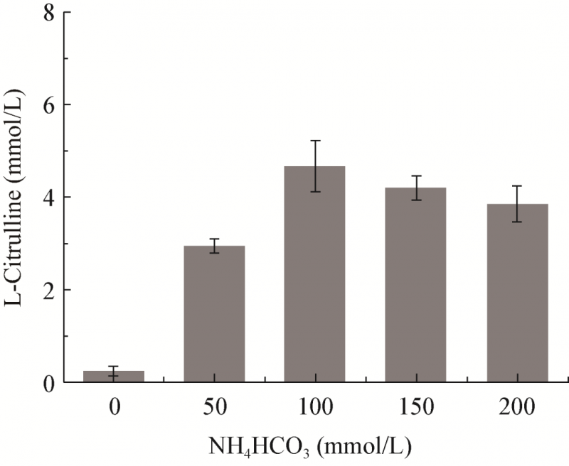 在大腸桿菌中過表達OTC,建立細胞水平氨甲酰磷酸檢測體系。在此基礎上比較不同來源的CK,發(fā)現(xiàn)大腸桿菌來源的CK效果最好,50 mmol/L NH4HCO3條件下全細胞催化9 h得到2.95±0.15 mmol/L L-瓜氨酸;過表達CPSⅡ時,50 mmol/L L-谷氨酰胺催化9 h得到3.16±0.29 mmol/L L-瓜氨酸。通過改變底物NH4HCO3濃度和引入外源L-谷氨酰胺合成酶(GS)等方式對CK與CPSⅡ的催化反應分別進行優(yōu)化后,100 mmol/L NH4HCO3條件下,L-瓜氨酸濃度分別提高至4.67±0.55 mmol/L和6.12±0.38 mmol/L,且過表達GS后CPSⅡ途徑可以利用NH3,不需要額外添加L-谷氨酰胺。