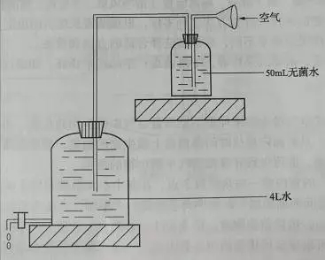 打開圖中大瓶的龍頭,空氣就被抽入無菌水中。待4L水流完,就有4L空氣通過小瓶中的無菌水,也就是4L空氣中的微生物被留存在50mL無菌水中。無菌吸取1mL過濾的水樣進行平板計數(shù),做2個平行。37℃培養(yǎng)48h計數(shù)。